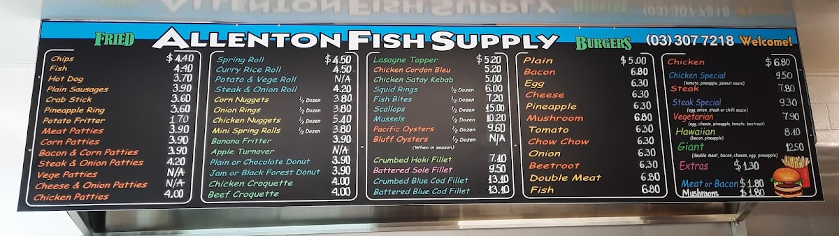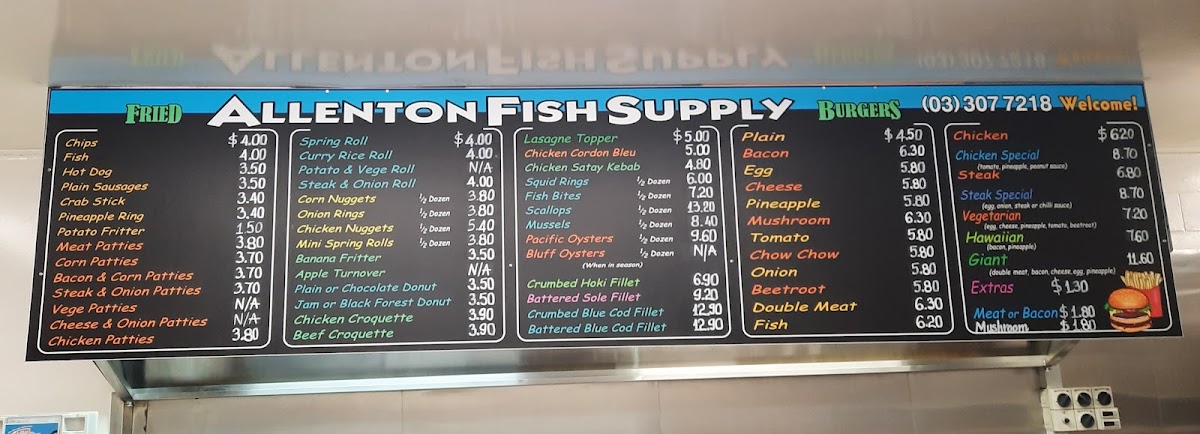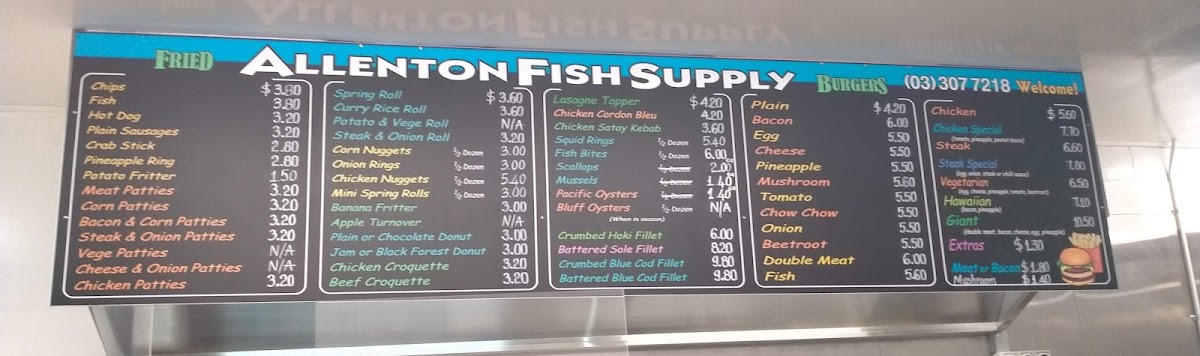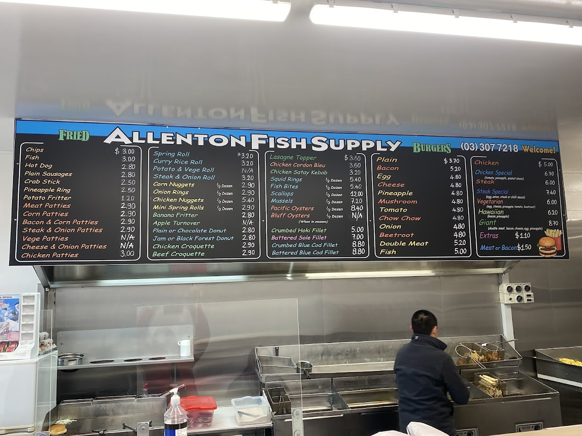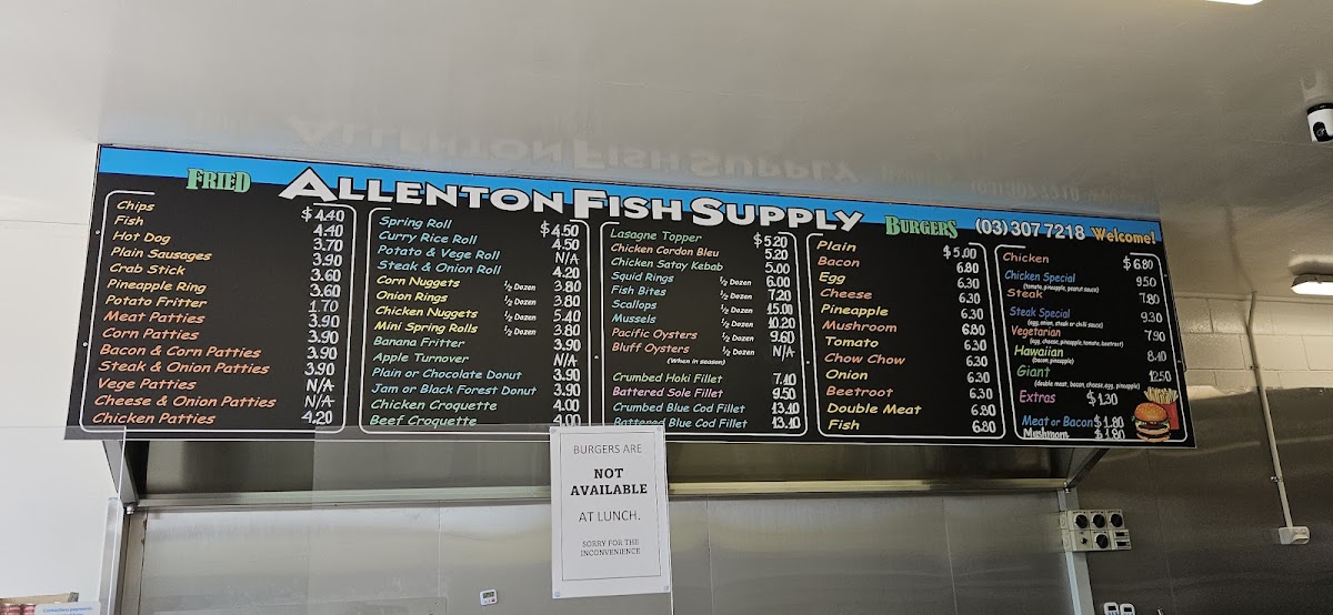 The menu at Allenton Fish Supply offers a variety of delicious fried items, including Chips, Fish, Spring Roll for $4.50, Curry Rice Roll for $3.50, and a Hot Dog priced at $3.60. For those craving a burger, they have several options like the classic Plain Burger for $6.50, Bacon Burger for $7.00, Egg Burger for $7.50, Cheese Burger for $7.00, and a tasty Pineapple Burger for $7.00. Additionally, the menu features several other satisfying dishes such as the Lasagne Topper for $6.50, Chicken Cordon Bleu for $9.00, Chicken Satay Kebab for $7.00, Squid Rings for $5.00, and Fish Bites for $6.50. With a diverse selection of affordable meals, Allenton Fish Supply is a great spot to satisfy your cravings for fried food, burgers, and more.